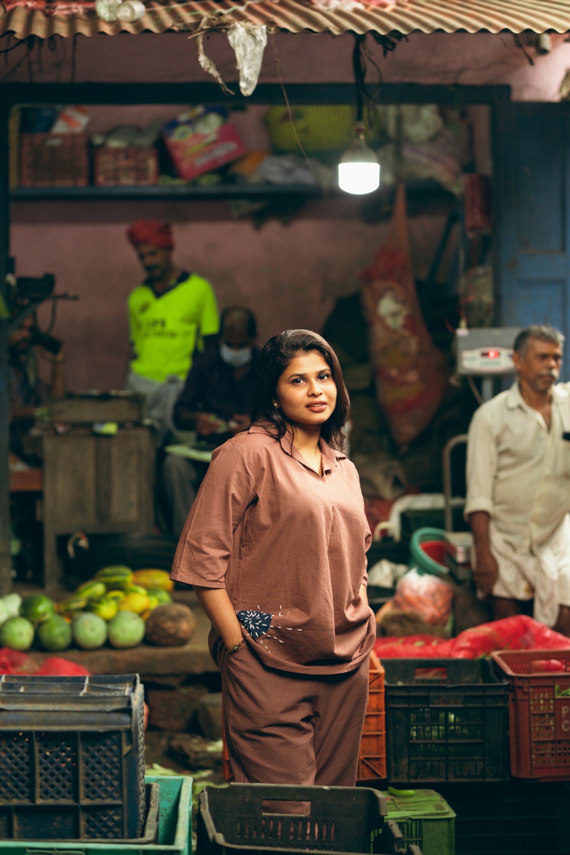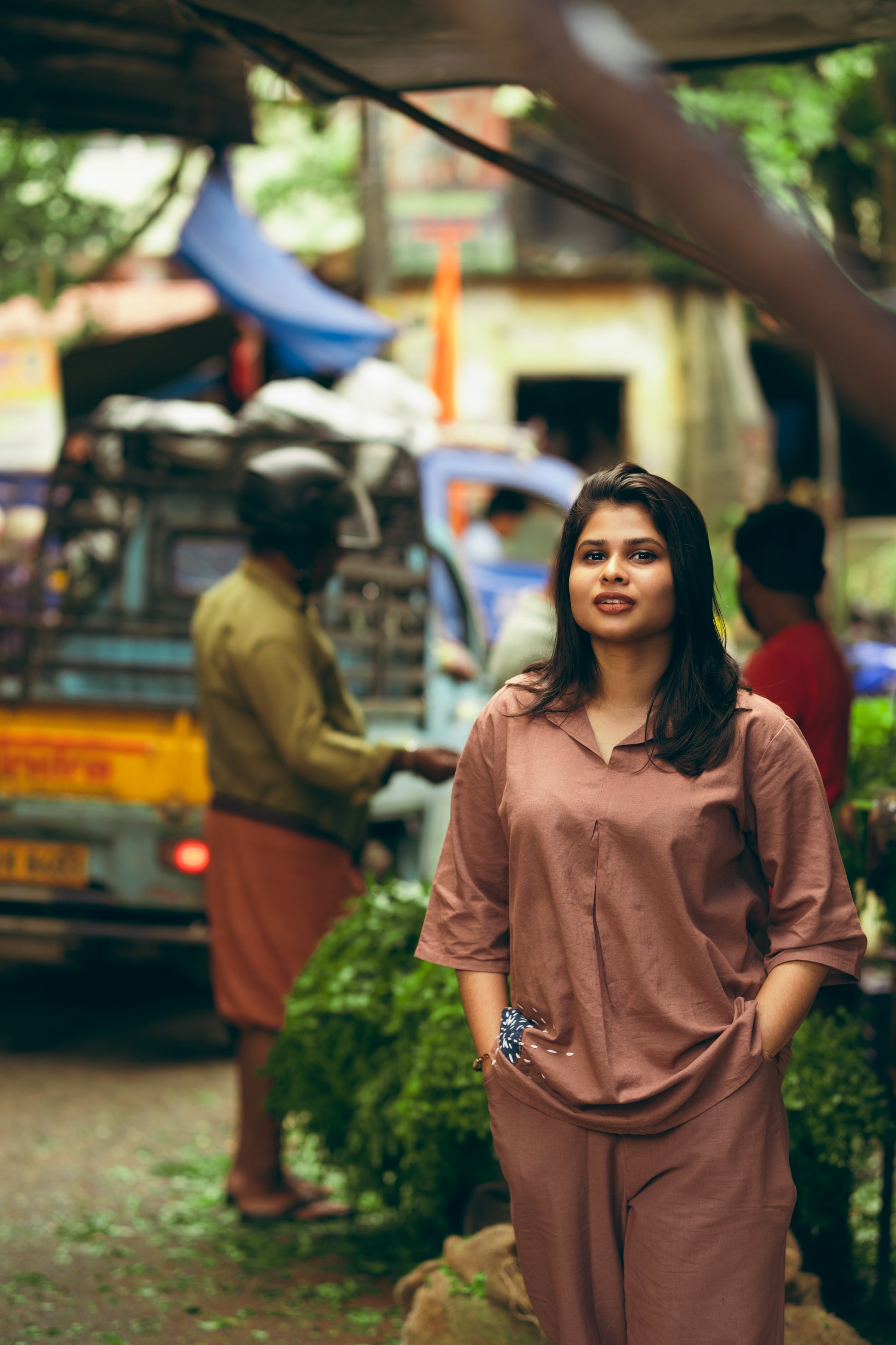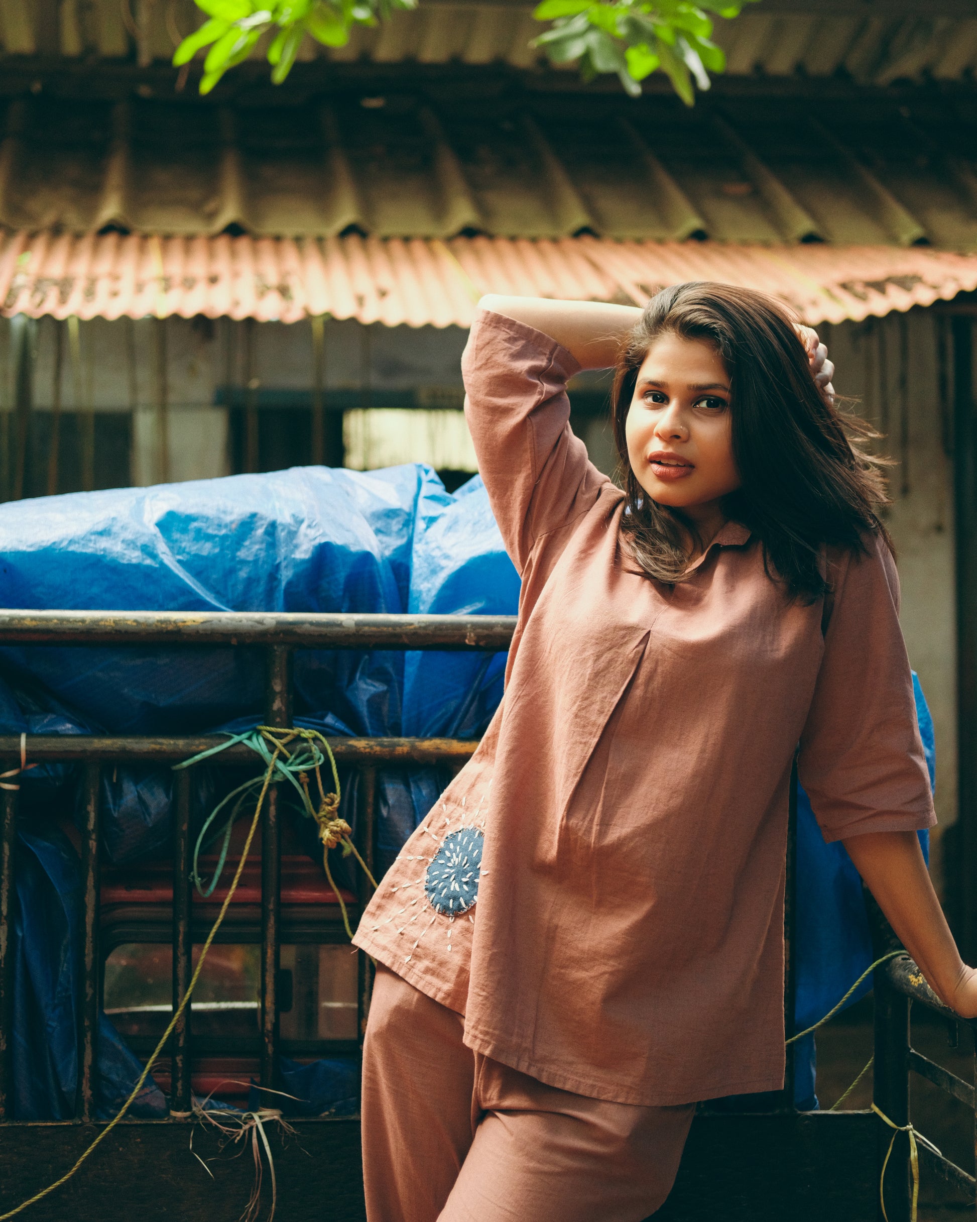 Elevate your office wardrobe with this sophisticated coord set in a warm bark color. Featuring exquisite hand applique work, it combines artisanal detail with a relaxed cotton fit for all-day comfort. Perfectly tailored for a polished yet effortless look, this set balances style and ease for your professional needs.